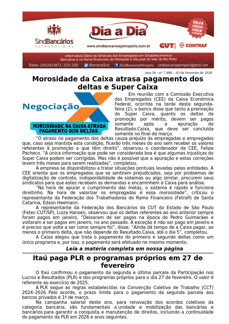 03/02/2026 - DIA A DIA ( Morosidade da Caixa atrasa pagamento dos deltas e Super Caixa )