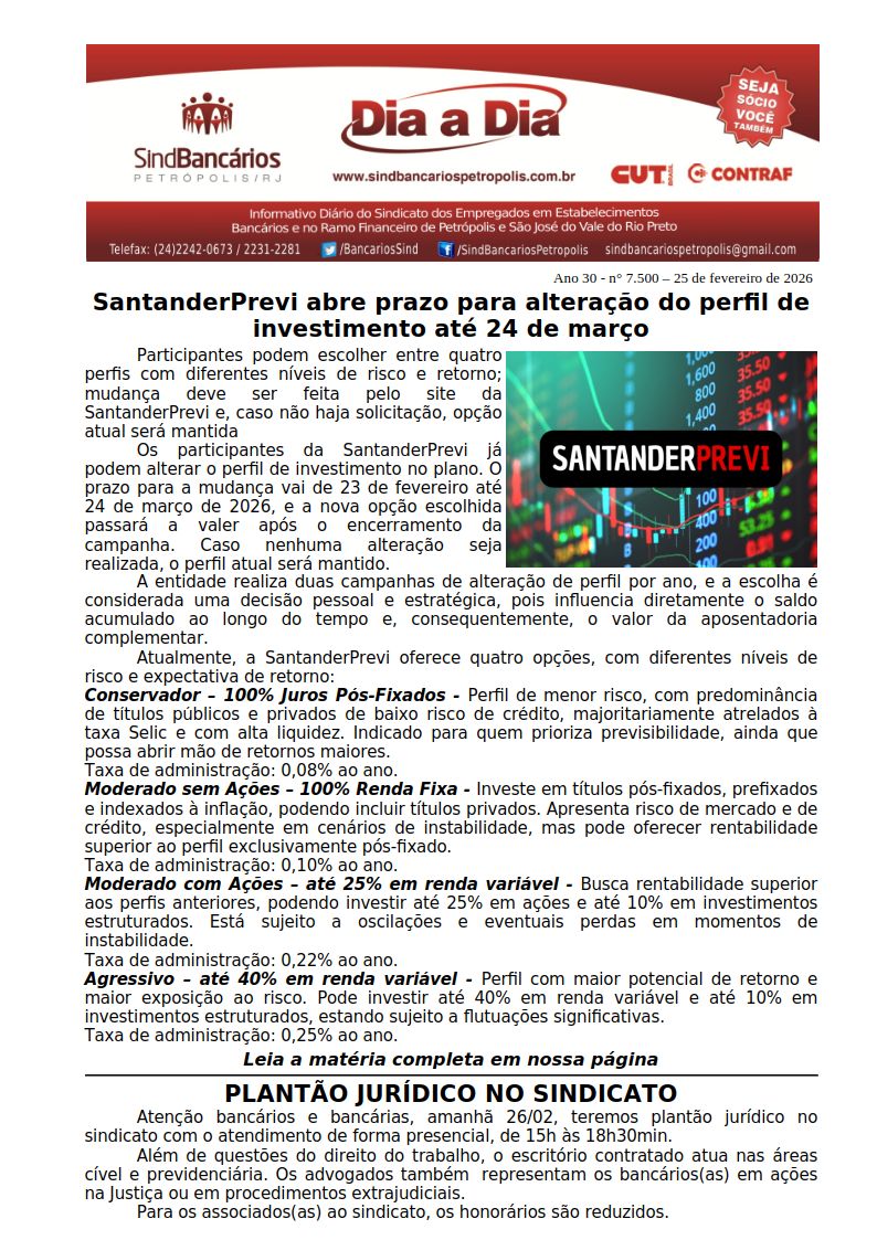 25/02/2026 - DIA A DIA (SantanderPrevi abre prazo para alteração do perfil de investimento até 24 de março)
