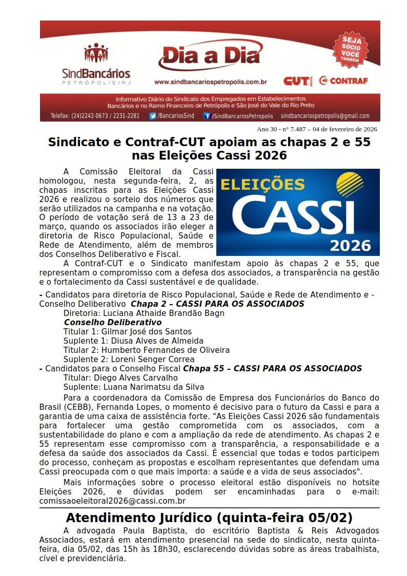 04/02/2026 - DIA A DIA (Sindicato e Contraf-CUT apoiam as chapas 2 e 55 nas Eleições Cassi 2026)