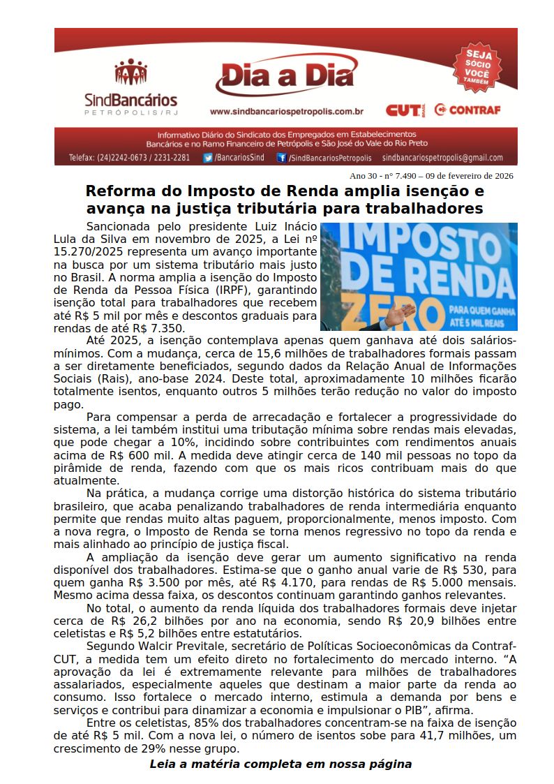 09/02/2026 - DIA A DIA (Reforma do Imposto de Renda amplia isenção e avança na justiça tributária para trabalhadores)