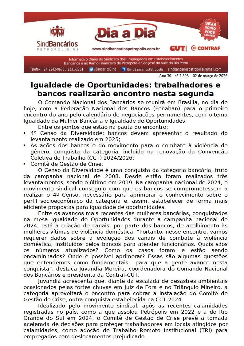 02/03/2026 - DIA A DIA (Igualdade de Oportunidades: trabalhadores e bancos realizarão encontro)