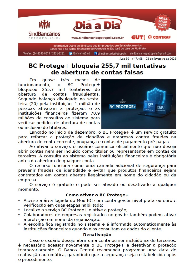 23/02/2026 - DIA A DIA (BC Protege+ bloqueia 255,7 mil tentativas de abertura de contas falsas)