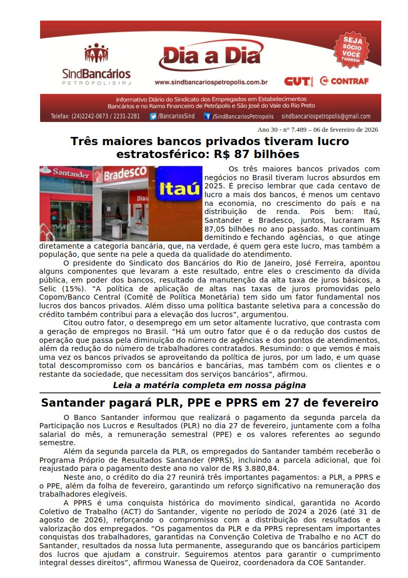 06/02/2026 - DIA A DIA (Três maiores bancos privados tiveram lucro estratosférico: R$ 87 bilhões )