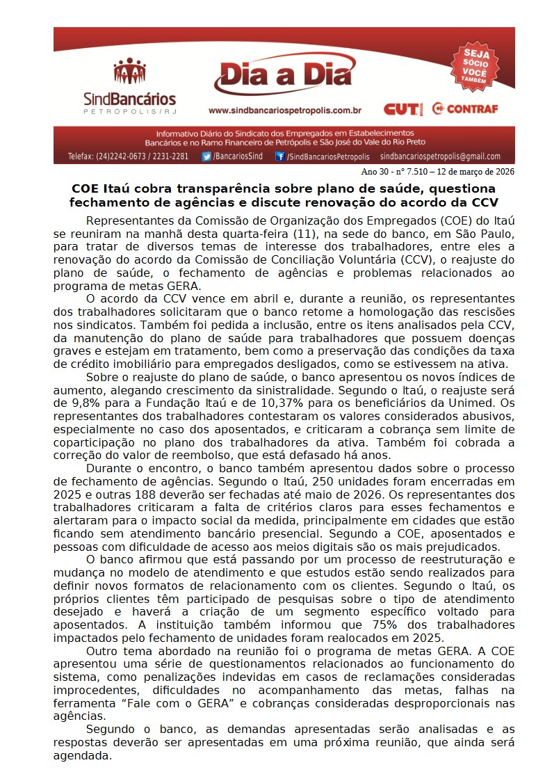 12/03/2026 - DIA A DIA (COE Itaú cobra transparência sobre plano de saúde, questiona fechamento de agências e discute renovação do acordo da CCV)