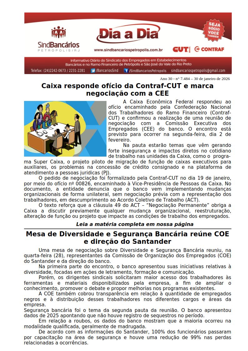 30/01/2026 - DIA A DIA (Caixa responde ofício da Contraf-CUT e marca negociação com a CEE)
