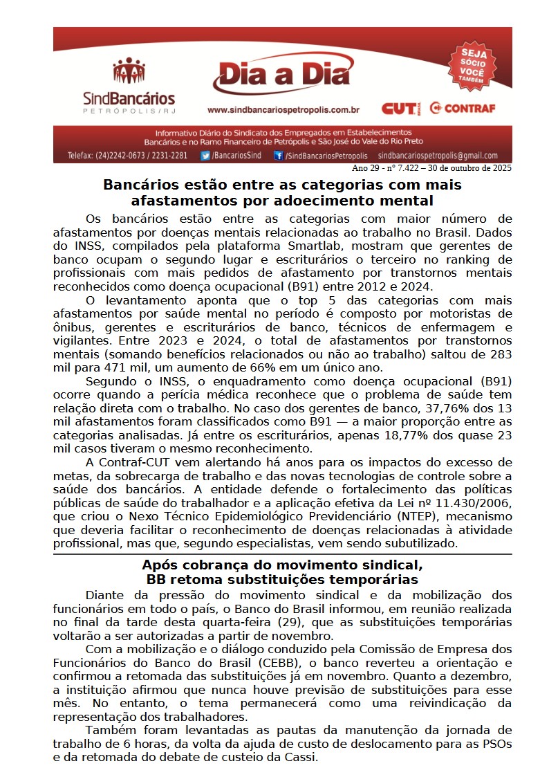 30/10/2025 - DIA A DIA (Saúde dos bancários / BB retoma substituições)