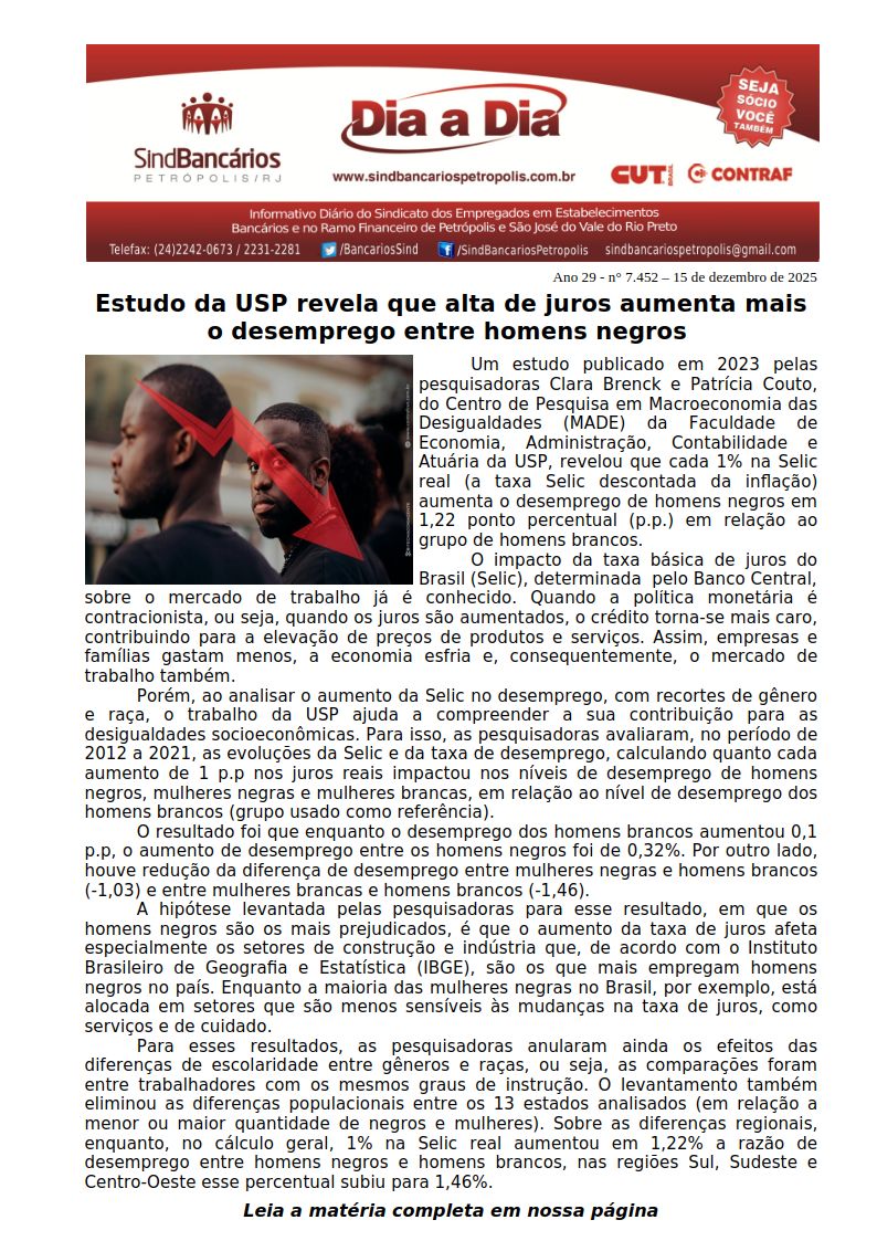 15/12/2025 - DIA A DIA (Estudo da USP revela que alta de juros aumenta mais o desemprego entre homens negros)