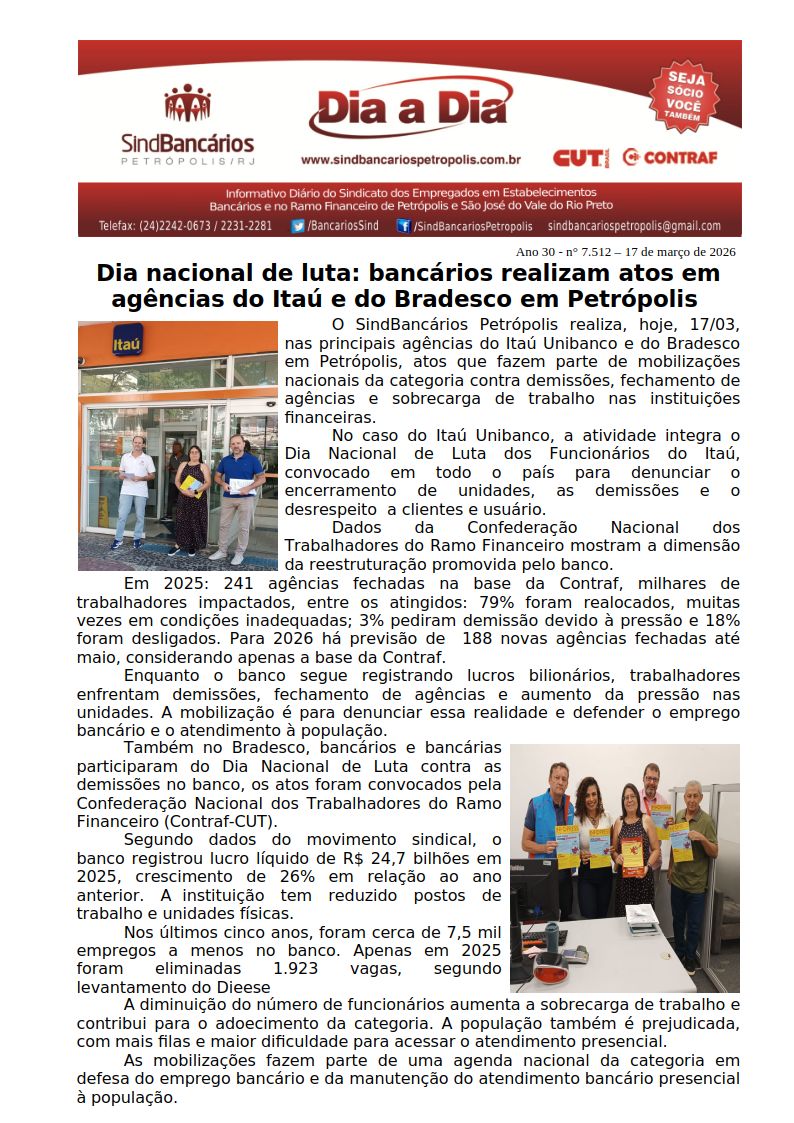 17/03/2026 - DIA A DIA (Dia nacional de luta: bancários realizam atos em agências do Itaú e do Bradesco em Petrópolis)
