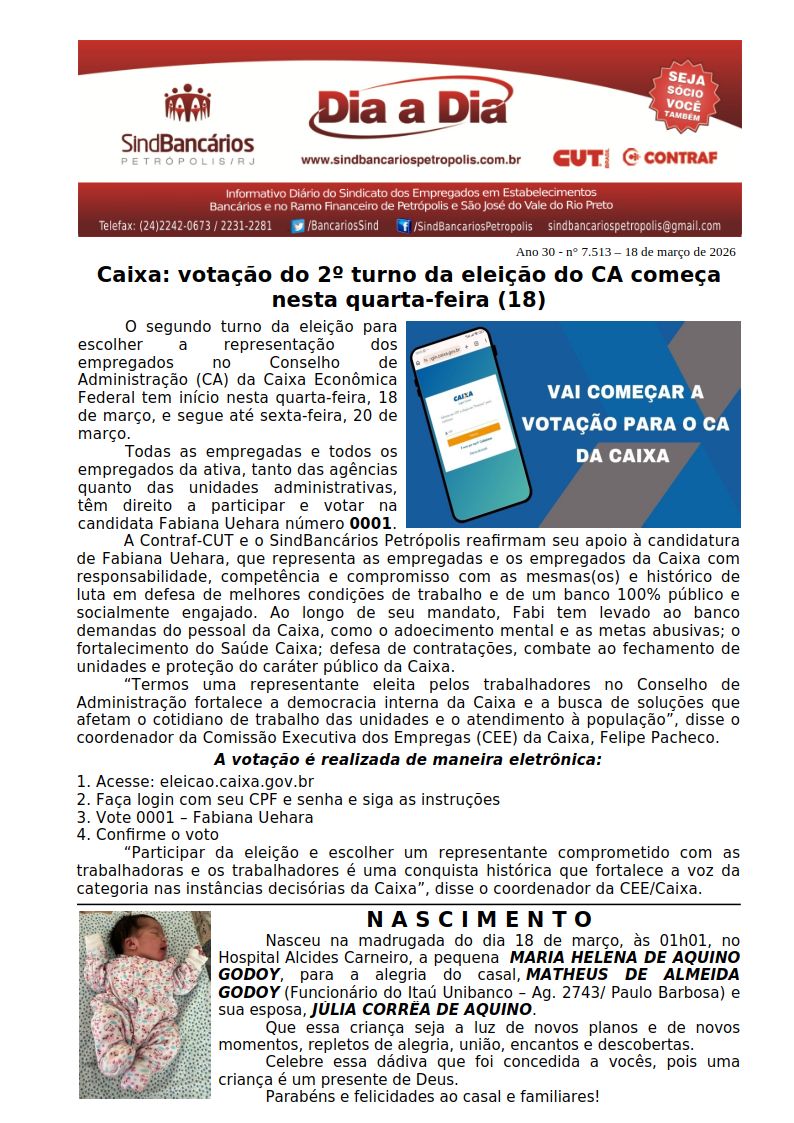 18/03/2026 - DIA A DIA (Caixa: votação do 2º turno da eleição do CA começa nesta quarta-feira (18))