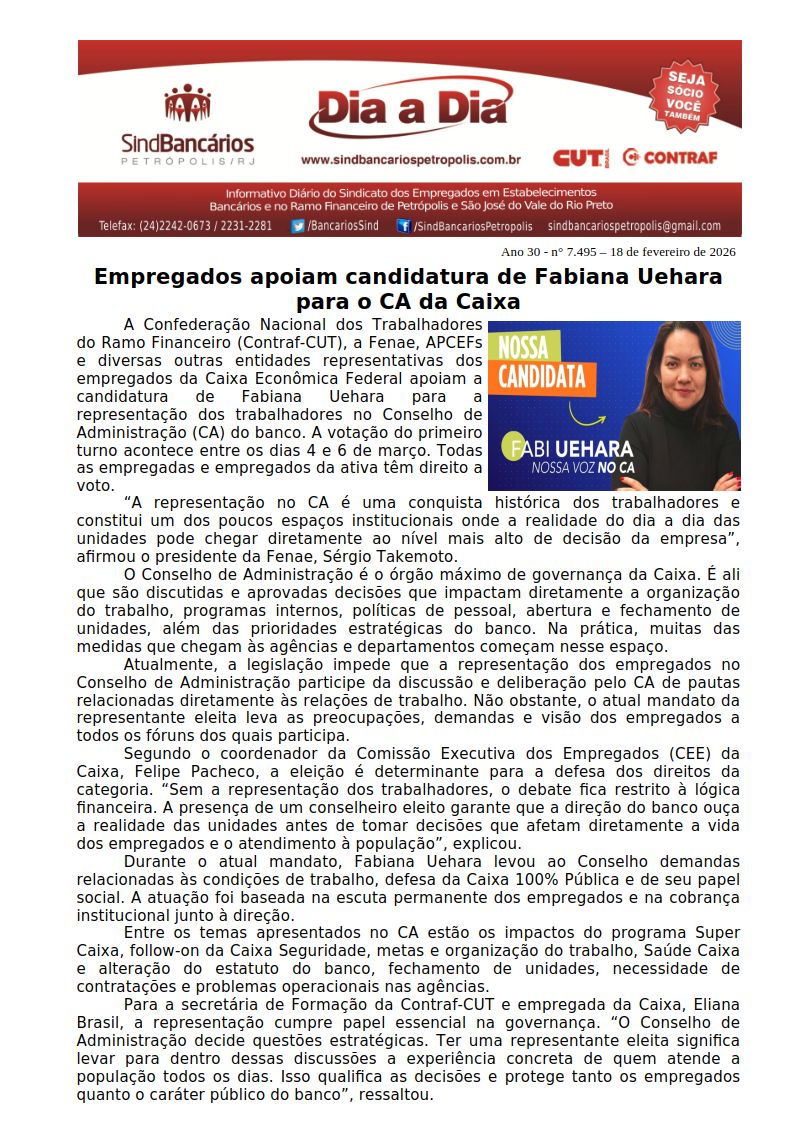 18/02/2026 - DIA A DIA (Empregados apoiam candidatura de Fabiana Uehara para o CA da Caixa)