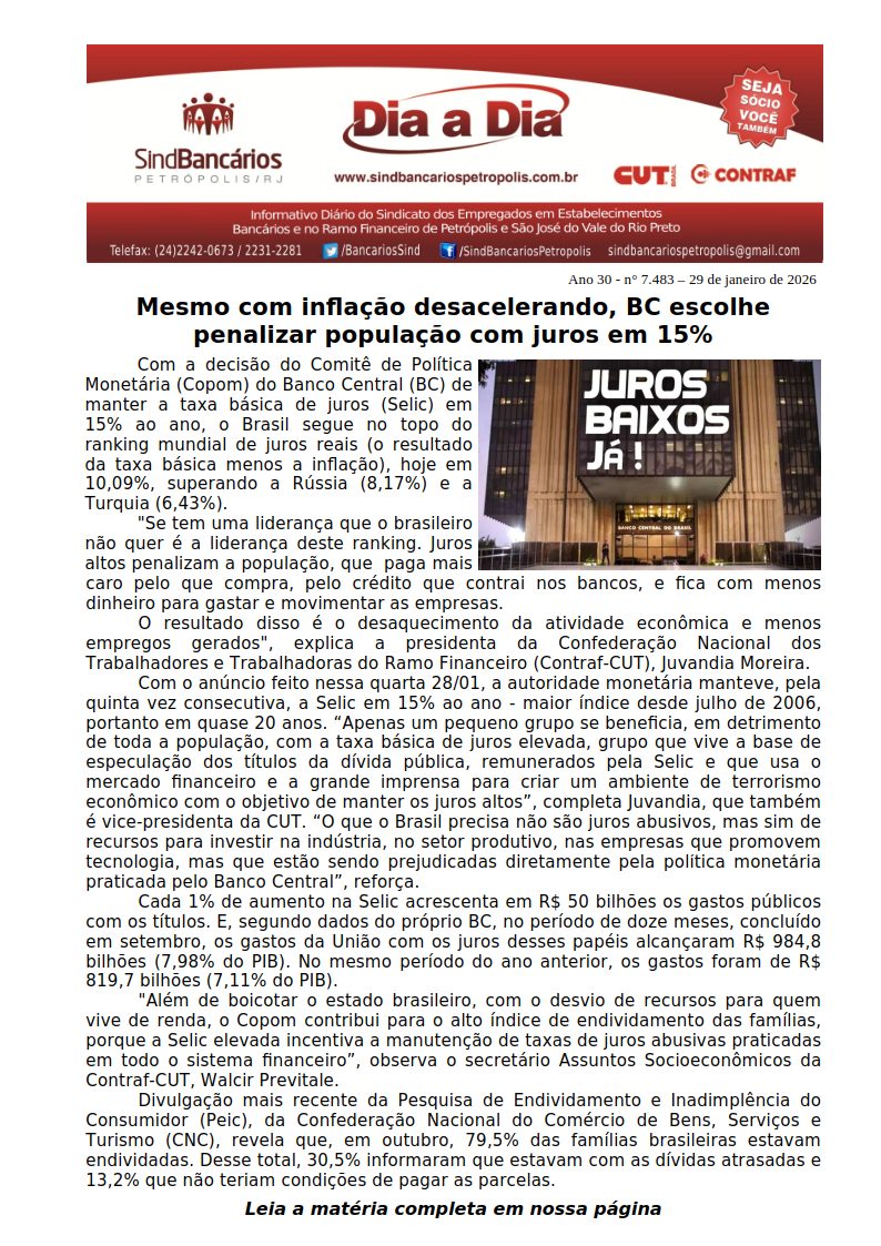 29/01/2026 - DIA A DIA (Mesmo com inflação desacelerando, BC escolhe penalizar população com juros em 15%)