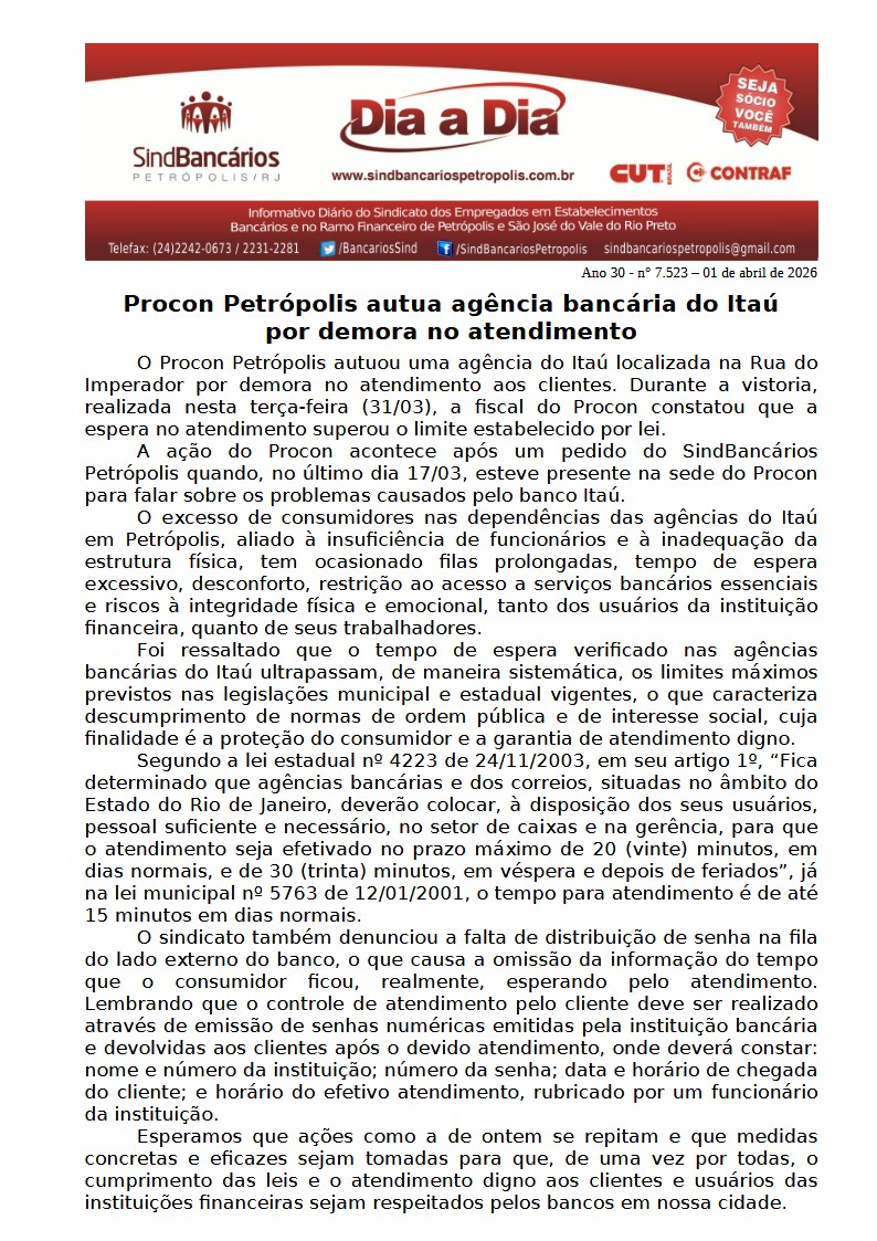 01/04/2026 - DIA A DIA (Procon Petrópolis autua agência bancária do Itaú por demora no atendimento)