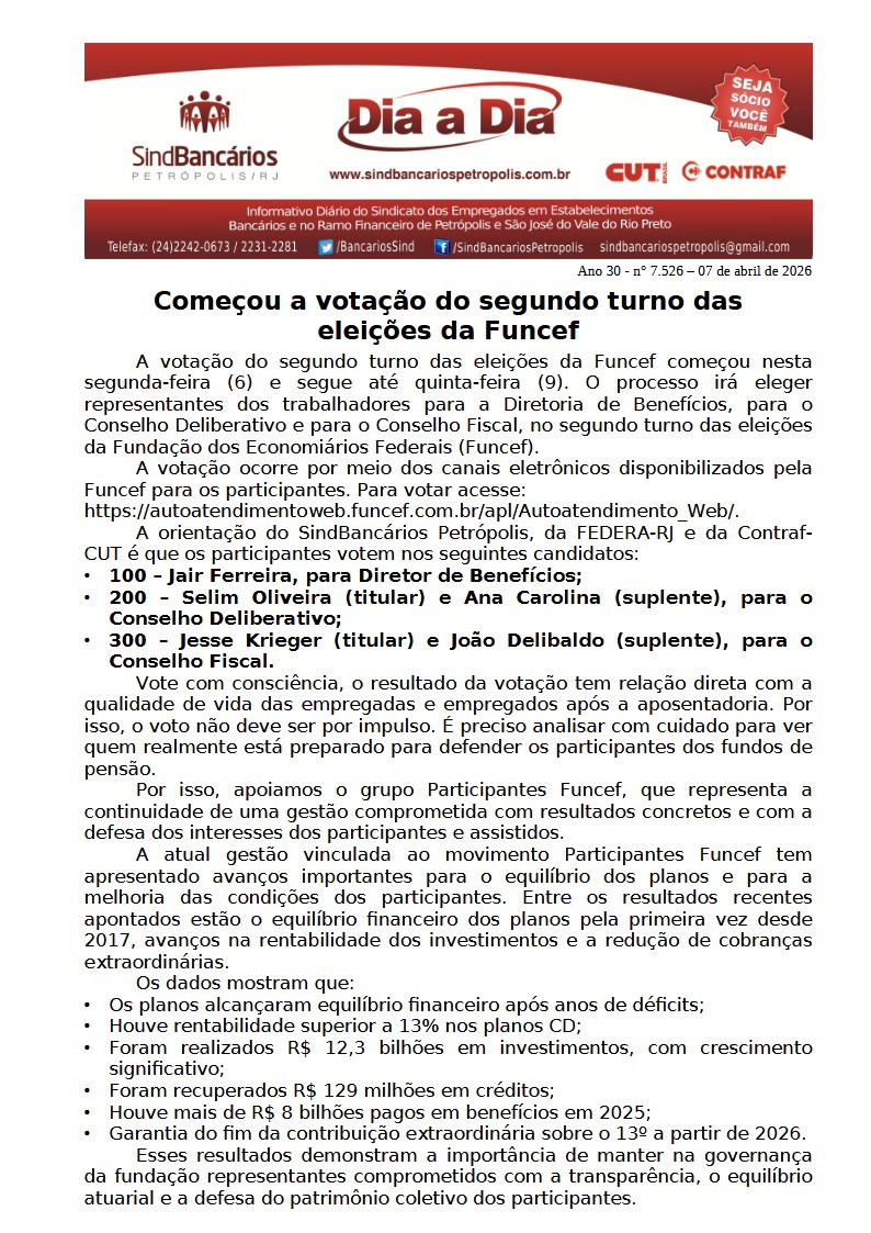 07/04/2026 - DIA A DIA (Começou a votação do segundo turno das eleições da Funcef)