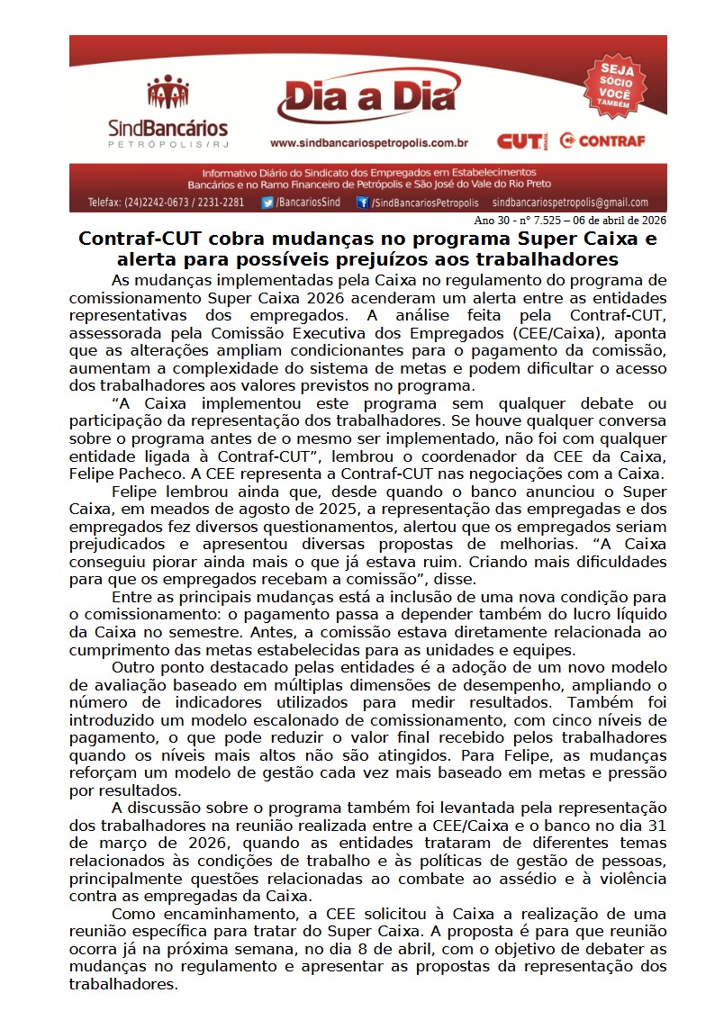 06/04/2026 - DIA A DIA (Contraf-CUT cobra mudanças no programa Super Caixa)